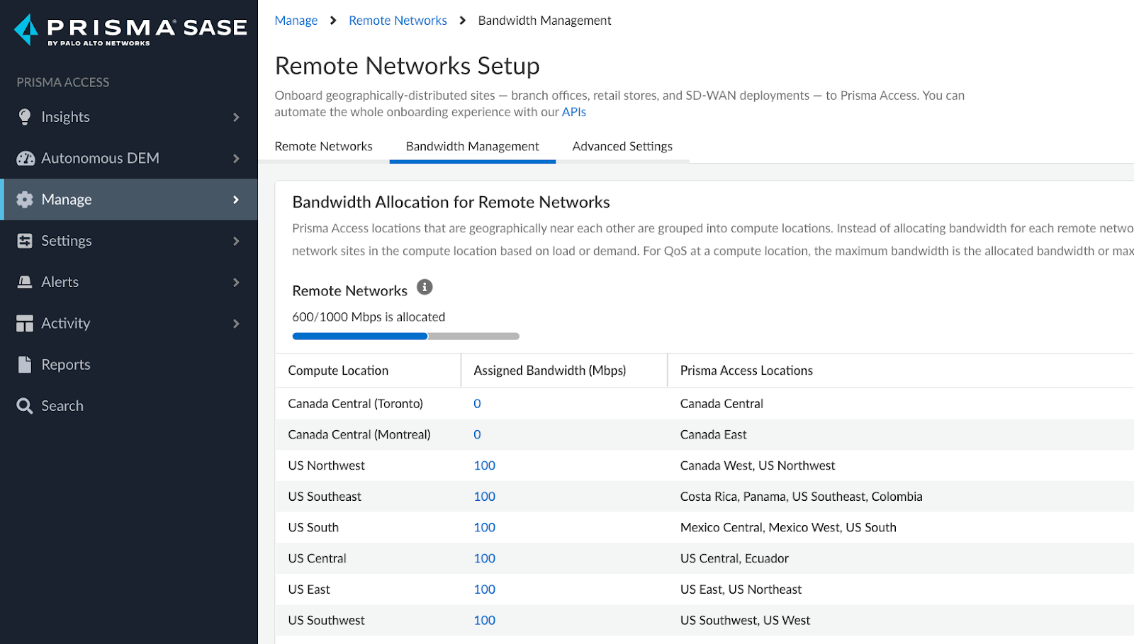 Navigate to Manage > Service Setup > Remote Networks and click on Bandwidth Management tab.