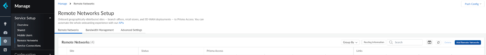 Onboard your Remote Network by Navigating to Manage > Service Setup > Remote Networks