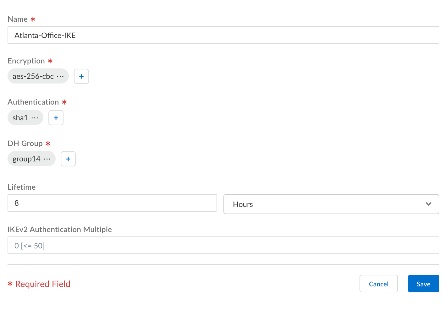 IKE Advanced Options > “Create New” and save configuration once parameters have been set.