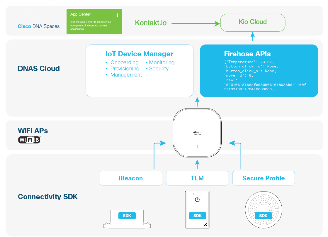 - The Kontakt.io Kio Cloud platform consumes data via the Cisco Firehose API.