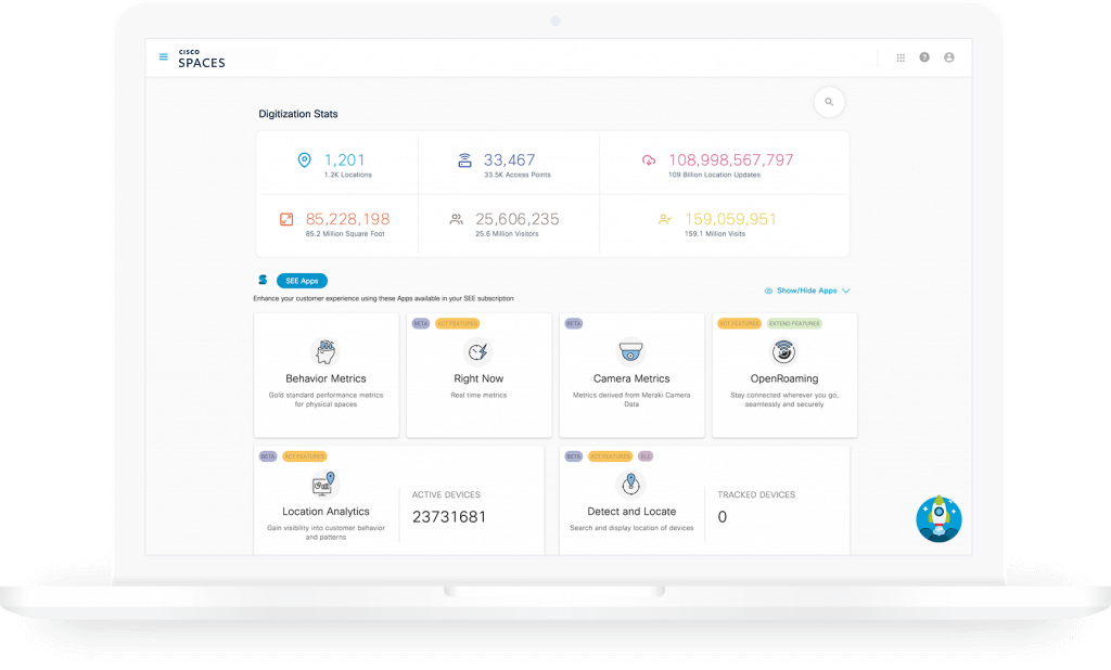 With Cisco Spaces, your Meraki network becomes more than just connectivity – it’s a powerful sensor for real-time occupancy, asset tracking, and more. Activate in just a few clicks and start driving powerful business outcomes.