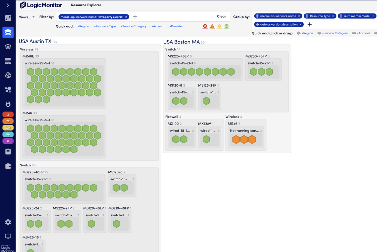 Enables small and simple to large and complex customers and service providers to monitor their Cisco Meraki environments in the context of their broader hybrid and multi-cloud infrastructures. LogicMonitor's Meraki integration monitors the most critical elements of Security Appliances (MX), Switches (MS and Catalyst), Access Points (MR and CW), Cellular Gateways (MG), Environmental Sensors (MT), Smart Cameras (MV), and Telegateways (Z). The integration uses the Cisco Meraki Dashboard API and Cisco Meraki Webhooks and if desired can layer-on additional telemetry via SNMP and Syslog.