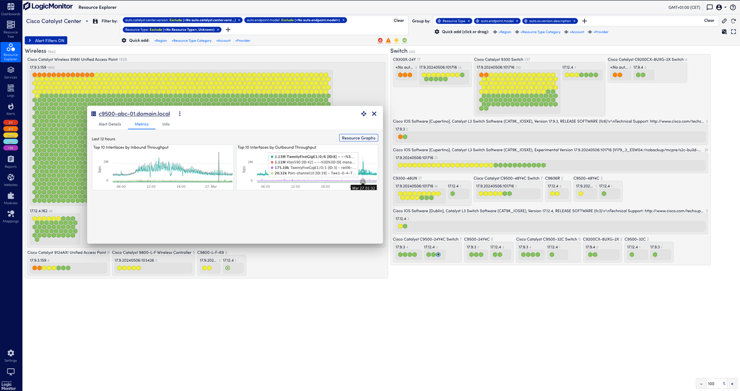 Enables small and simple to large and complex customers and service providers to monitor their Cisco Catalyst Center environments in the context of their broader hybrid and multi-cloud infrastructures. This integration helps customers that are new to Cisco and Catalyst Center (formerly DNA Center) and those who are migrating from Prime Infrastructure. LogicMonitor leverages the Catalyst Center API to discover the site hierarchy and all of the devices Catalyst Center manages, so you can start monitoring them in minutes.