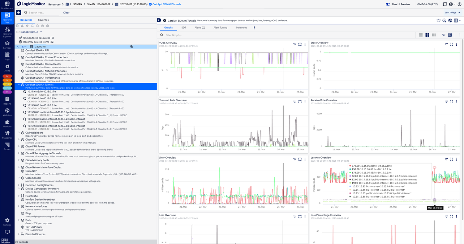 Enables small and simple to large and complex customers and service providers to monitor their Cisco Catalyst SD-WAN environments in the context of their broader hybrid and multi-cloud infrastructures. Environments can be all Cisco, new and old technologies, or multi-vendor. LogicMonitor integrates with the Catalyst SD-WAN Bulk API for SD-WAN specific metrics and alarms and layers on available SNMP, Syslog, and Netflow data to provide access to rich telemetry for capacity planning, troubleshooting, and root cause analysis.
