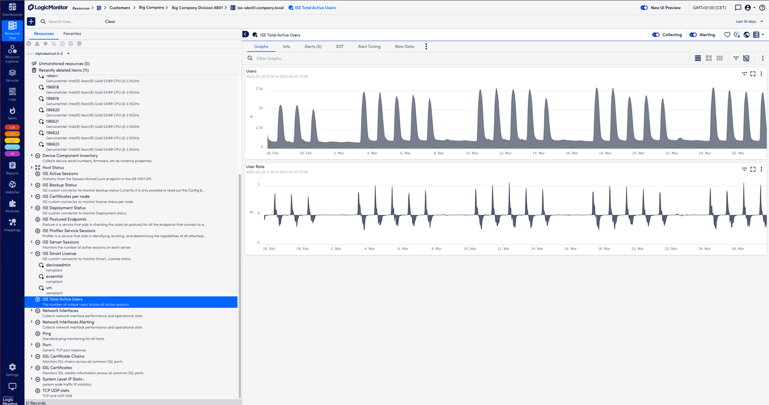 Enables small and simple to large and complex customers and service providers to monitor their Cisco ISE environments in the context of their broader hybrid and multi-cloud infrastructures. Monitors server and user sessions, ISE deployment status, licensing, certificates, syslog events, and system performance.